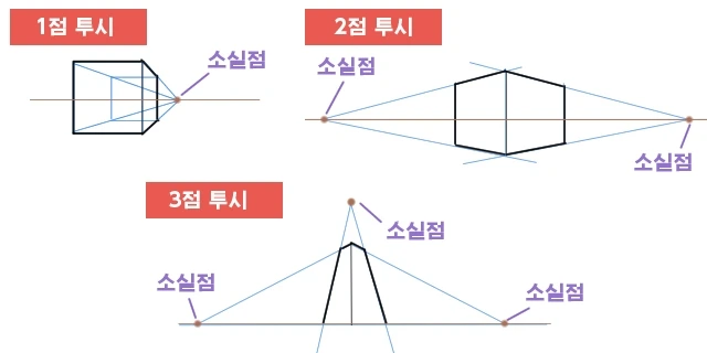 1점 투시, 2점 투시, 3점 투시의 용도는 아래와 같다