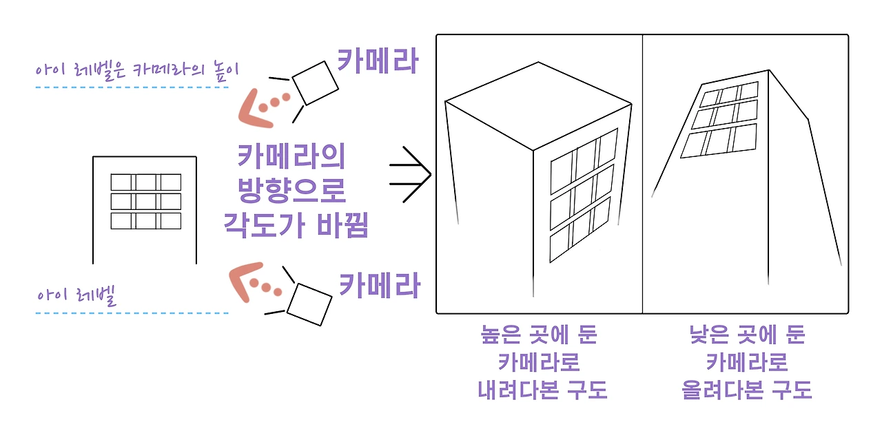 3점 투시처럼 소실점과 아이레벨을 다르게 설정함으로써 생기는 높이의 왜곡은 표현이 되지 않는다.([그림3]의 충감도시점, 조감도 시점)