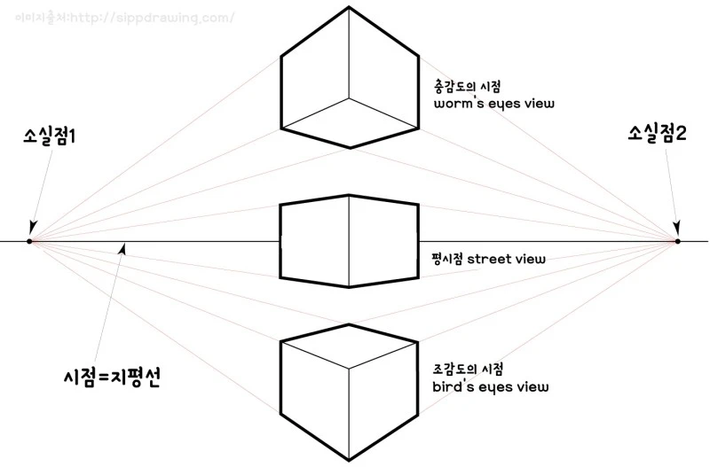소실점보다 시각(아이레벨)을 높게 설정하여 위에서 바라보고 그리는 것을 2점 투시를 그릴 수는 있지만,