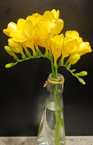 집에 와서 프리지아를 꽂을 꽃병을 찾았지만 마땅한 게 없었다. 그러다 식초를 담아 두었던 삼각 플라스크 모양의 유리병을 찾아냈다. 유리병에 물을 가득 담고 프리지아를 꽂고 지끈으로 중간에 고정을 시켰다. 그리고 식탁 위에 두었다. 노랗게 하나씩 꽃이 피기 시작하니 참 예뻤다. 아내 ‘선’에게 춘이 물었다.