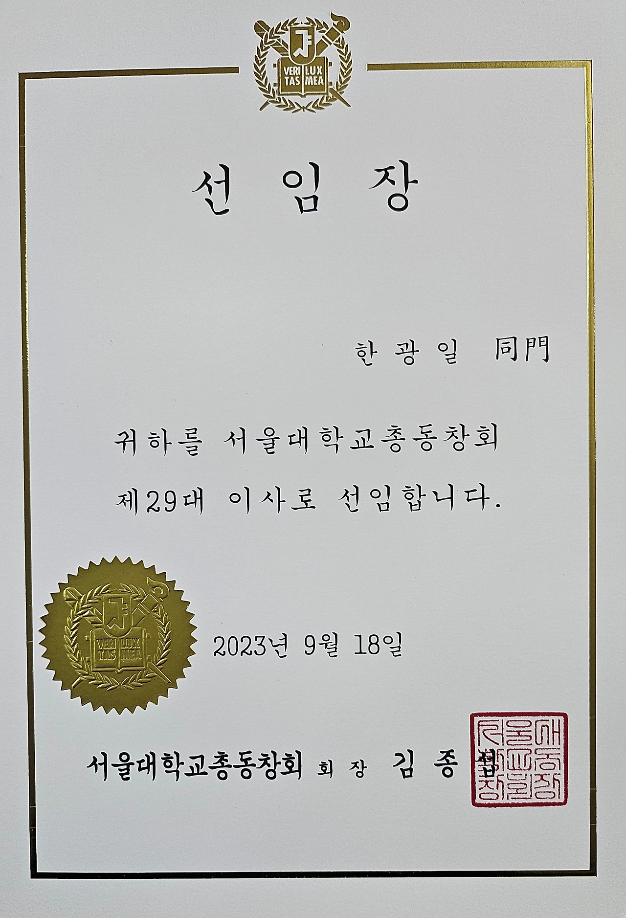 한광일 서울대학교 총동창회 이사선임 소소한 행복