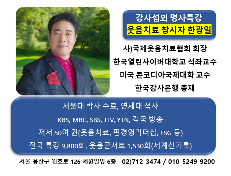 한광일 강사는 세계예술치유박사위원회 총재, ESG강사협회 회장, 한국열린사이버대학교 석좌교수, 국제웃음치료협회 회장 등으로 활동 중이다. 연세대학교 석사(전과목 만점), 서울대학교 산림환경학 박사를 수료했다.