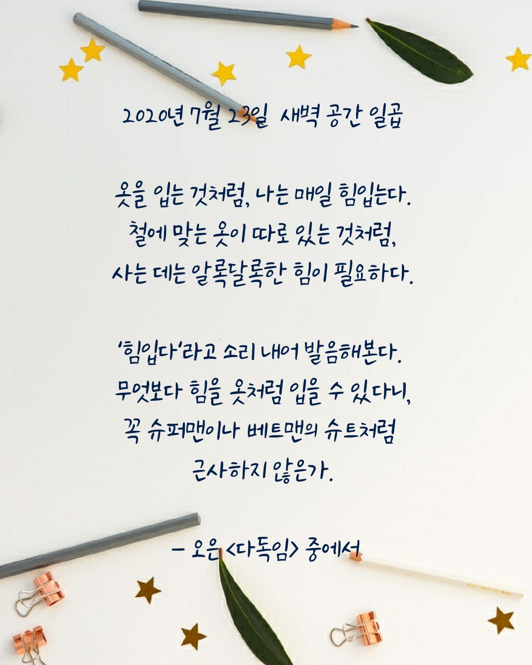 옷을 입는 것처럼, 나는 매일 힘입는다. 철에 맞는 옷이 따로 있는 것처럼, 사는 데는 알록달록한 힘이 필요하다. 꼭 커다랗지 않아도 된다. 자잘해도, 즉각적인 반응을 이끌어내지 않아도 그 힘은 공기처럼 나를 감싼다. '힙입다'라고 소리 내어 발음해본다. 무엇보다 힘을 옷처럼 입을 수 있다니, 꼭 슈퍼맨이나 배트맨의 슈트처럼 근사하지 않은가.