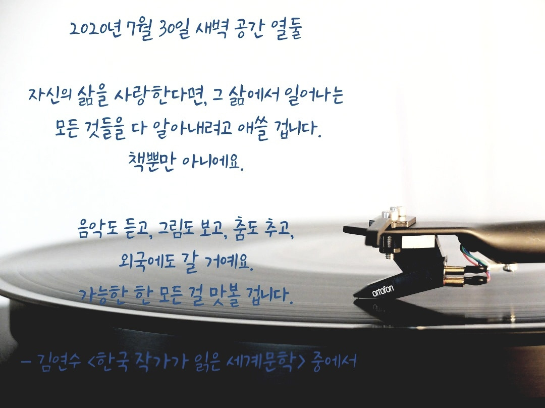 창밖에 빗소리가 조금 잦아들었다(피해가 크지 않아야 할 턴데). 천둥과 번개가 비켜간 자리에 빛과 고요가 찾아오기를.이제 책을 읽고 음악을 듣는 일에 시간을 써야겠다. 사랑하는 나의 삶을 위해.
