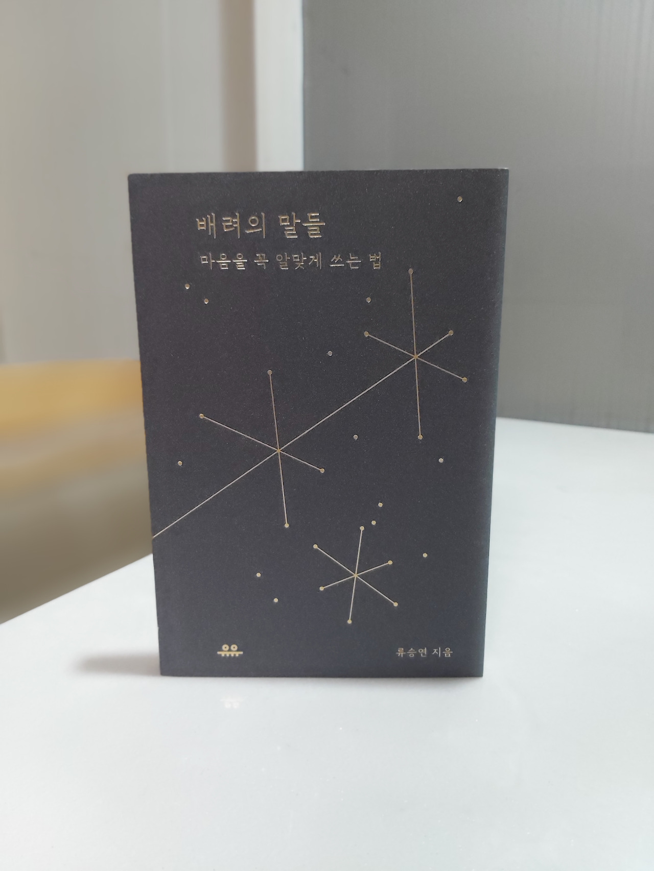 틈틈이 읽은 책은 류승연 작가의 『배려의 말들』이었다. 지난 금요일에 서점에 갔다가 우연히 발견한 책이었다. 읽지 않은 책들이 집에 많아서 잠깐 구경만 하고 오려고 했는데. 검은 바탕에 금색으로 박혀 있는 제목이 눈에 들어왔다. 책을 들어서 살펴보니 유유 출판사에서 만드는 '문장 시리즈'였다.출판사에 대한 신뢰는 물론 『쓰기의 말들』과 『태도의 말들』을 좋게 읽은 터라 사지 않을 수가 없었다.
