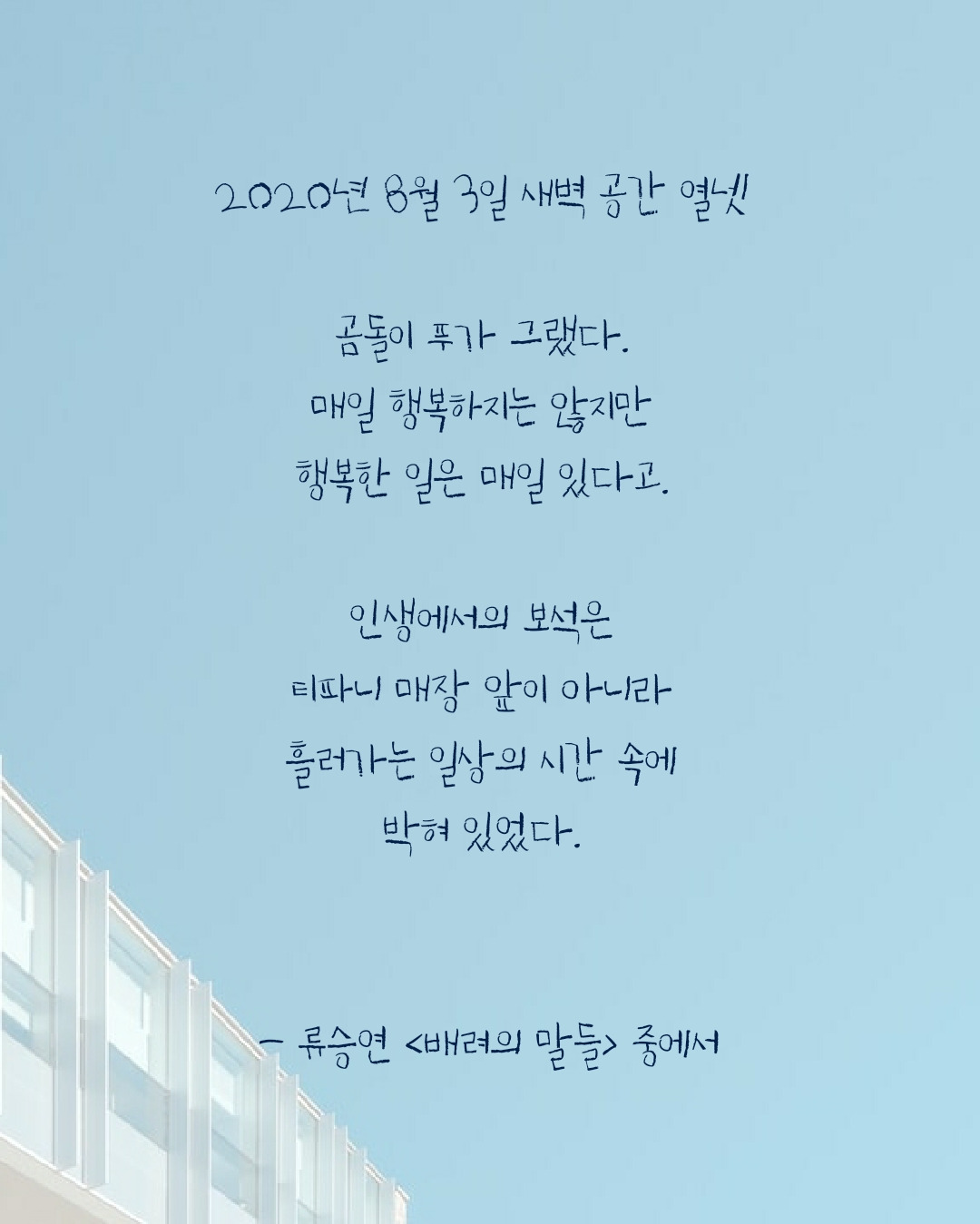 매일이 새롭다. 매일 쓰면 익숙해질 줄 알았는데 역시 생각대로 되는 일은 많지 않다. 언젠가 매일 아침 운동을 하시는 분께 "이제 운동이 몸에 붙어서 자연스러우실 것 같아요."하고 말을 건넨 적이 있는데, 의외의 대답이 돌아왔다. "아침마다 운동하기 싫어서 힘들어요." 운동을 하고 나면 개운하긴 하지만 막상 시작하려면 귀찮은 마음이 앞선다고 하셨다.
