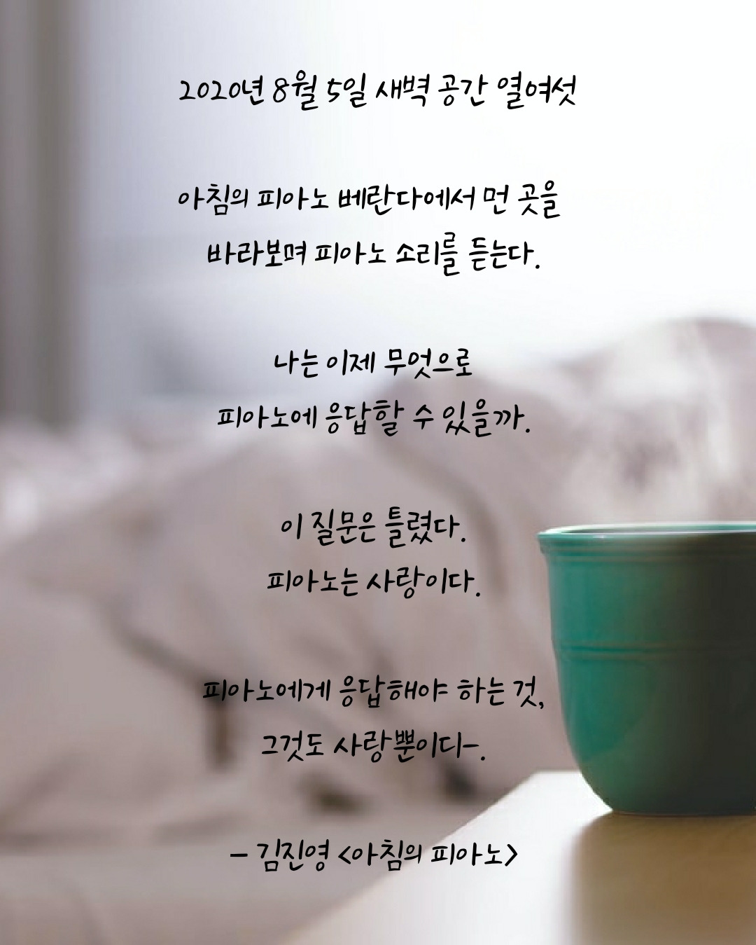 아침의 피아노 베란다에서 먼 곳을 바라보며 피아노 소리를 듣는다. 나는 이제 무엇으로 피아노에 응답할 수 있을까. 이 질문은 틀렸다. 피아노는 사랑이다. 피아노에게 응답해야 하는 것, 그것도 사랑뿐이다.