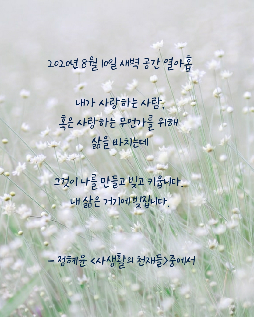 문학을 잘 읽어내는 사람이 되고 싶다. 따뜻하고, 세밀한 시선으로 텍스트를 읽고 쓸 수 있기를 바란다. 깊어지기 위해서는 공부의 시간이 필요하다. 이제 새벽 공간에서 필사를 해야겠다. 고요한 시공간에서 평론집을 읽고, 베끼는 시간들이 아직 서툴기만 한 문장과 사유를 다듬어줄 수 있을 거라고 믿는다.