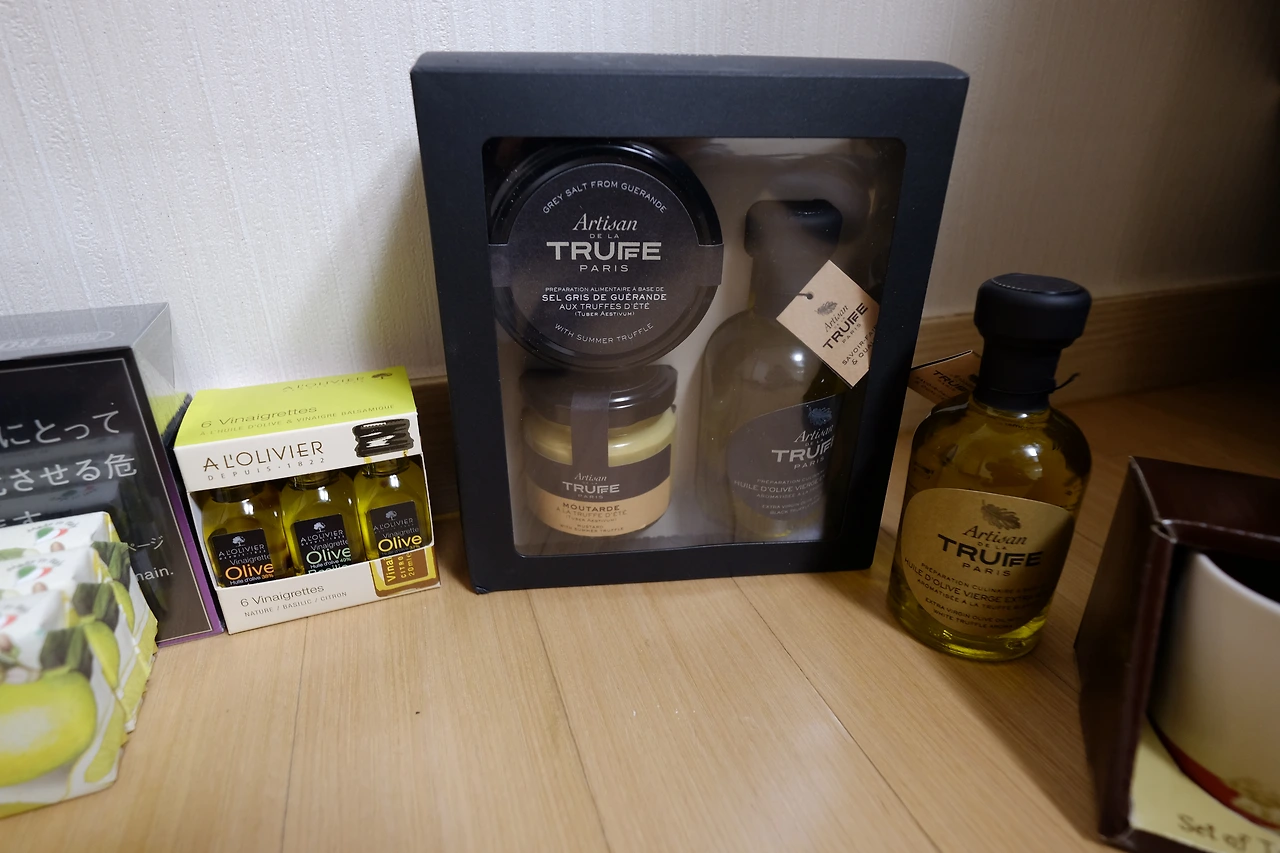 저 세트에는 블랙 트러플 오일과 트러플 소금, 트러플 머스타드가 들어있다. 화이트 트러플 오일도 궁금해서 그건 따로 구매했다. 세트는 40유로 정도 했던 거 같고, 오일 단품은 아래 사진에서도 확인할 수 있지만 대략 26.9유로였다. 그외에 왼쪽에 있는 올리브유 세트는 10유로 정도였다.