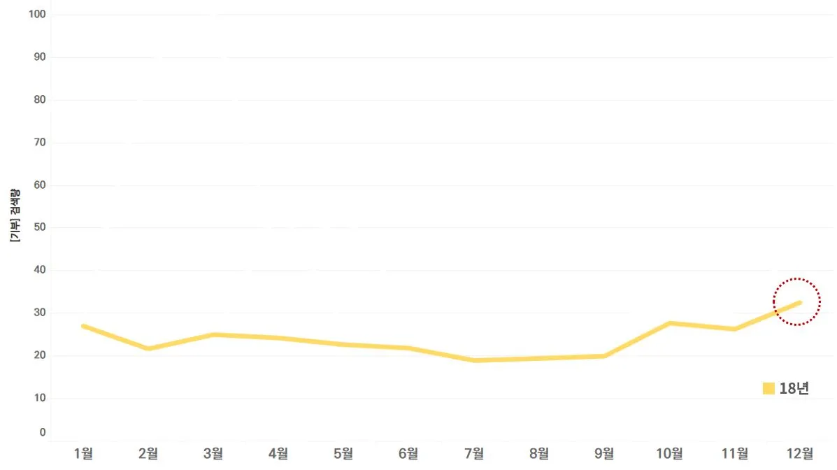 [표 1]에서 보면 18년 기부 키워드 검색량은 큰 변화 없이 평탄하게 유지되며 비교적 연말연초에 상승하는 추이를 보이는 것을 볼 수 있다.