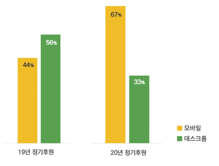 [표1. 2개년 NGO 웹페이지 배너광고 유입수 비율 비교][표1]은 웹사이드 방문 중 배너광고 유입을 구분하여 모바일 배너광고 유입과 PC 배너광고 유입의 2개년 흐름을 나타내는 그래프이다. 앞서 다섯 번째 주제에서 다룬 NGO 디지털 모금 PC vs 모바일 트렌드에서 모바일 중심의 유입자와 퍼포먼스 증가에 대해 데이터 흐름을 볼 수 있었다. 이러한 모바일 트렌드를 만들어내는 주요한 요인 중에 하나가 바로 위에서 보이는 배너광고 트렌드에서 큰 영향을 받았다.