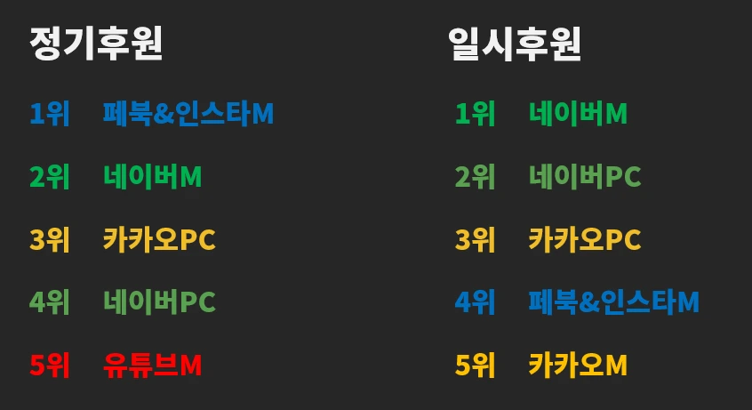 [표5. 20년 NGO 배너광고 퍼포먼스 정기/일시 TOP 5 채널]마지막으로 [표5]는 20년 배너광고를 통해 정기후원과 일시 후원 퍼포먼스를 주도하는 TOP 5 채널을 나타냈다. TOP 5 채널은 전체 배너광고 중 방문수 75%, 정기후원 82%, 일시 후원 85% 등 대부분의 퍼포먼스가 TOP 5 채널에서 이루어졌다. 정기후원과 일시 후원의 TOP 5 채널을 보면 1위부터 4위까지 순위 변동은 있지만 주요 배너광고 채널이 퍼포먼스를 만들어내는 모금 핵심 채널로 자리매김하고 있다.