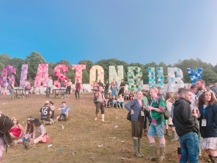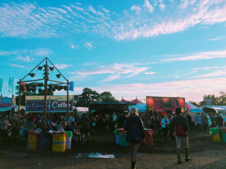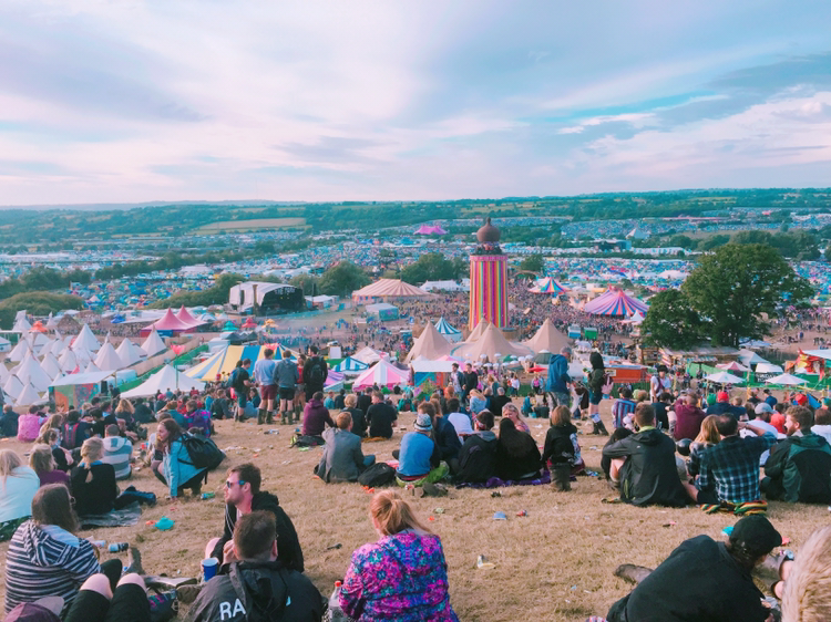 패딩턴을 출발한 기차는 카슬캐리에 도착해 페스티벌에 가는 모든 사람들을 그 역에서 내려준다. 이미 가는 길에 맥주를 마시기에 여념이 없고, 중간에는 랩 배틀도 한번 벌어졌다. 라임 하나 하나에 환호하며 반응하는 사람들은 흥이 오를 데로 올라 있었다. 기차역에서는 무료 셔틀이 공연이 이루어지는 월시팜까지 데려다주는데, 주변에 정말 아무 것도 없으니 그렇지 않으면 갈 수 있는 재간이 없다. 도착하는 순간부터 푸른 잔디가 끝없이 펼쳐진다. 같은 셔틀버스에 탄 사람이 넘치는 흥을 주체하지 못해, 오는 길 내내 When I say Glaston, you say bury, Glaston-bury! 같은 추임새를 유도하거나, 질문을 하면 무조건 3개 단어로 답하기 같은 아무나에게 던지는 퀴즈 폭격을 맞아가며 정신없이 오다보니 어느새 글라스톤베리페스티벌 사이트에 도착해 있었다. (그래서 그녀가 나한테 던진 질문은, 이전에 글라스톤베리에 와 본 적 있냐는 질문이었고 그에 대한 내 대답은 I've been here였다. 이럴 땐 더 재미있는 사람이고 싶다.... 농에 능한 자이고 싶다. 왜 더 참신한 대답은 생각나지 않는 걸까!)