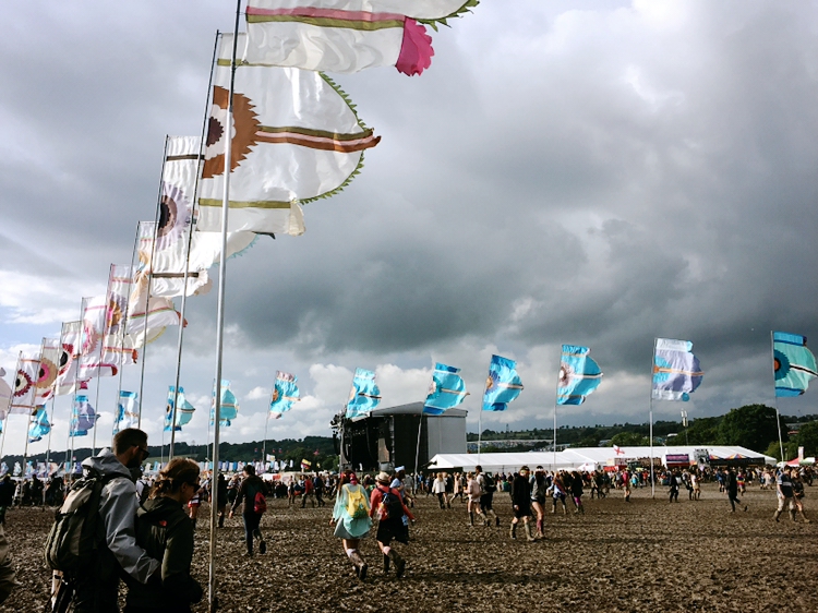 다행히 도착하는 날에는 비가 오지 않았다. 버스에서 내려 스탭들이 던져준 가방을 다시 들쳐메고 티켓을 찾기 위해 매표소로 향했다. 티켓을 찾고 가방 검사를 한 이후, 티켓을 팔찌로 교환해 빠지지 않도록 팔찌에 있는 고리를 (조금 무섭게 생긴 펀치같은 것으로) 고정시키면, 입장 게이트로 진입할 수 있다. 푸르게 있던 잔디는 입구로 오는 길목에서 이미 진흙으로 변해있었다. 이미 글라스톤베리가 시작하기 일주일 전부터 계속 비가 오기도 했고, 글라스톤베리가 얼마나 진흙탕이 되었는지가 심지어 뉴스거리일 정도였던 걸 보면 아무래도 글라스톤베리페스티벌은 매년 많은 사람들이 궁금해하는 큰 이슈이긴 한 모양이다. 내가 떠나기 전에도 같은 집에 사는 플랏메이트도 '지금 이미 진흙투성이라던데'라며 이미 글라스톤베리 땅에 대해서 나보더 잘 알고 있었으니 말이다.