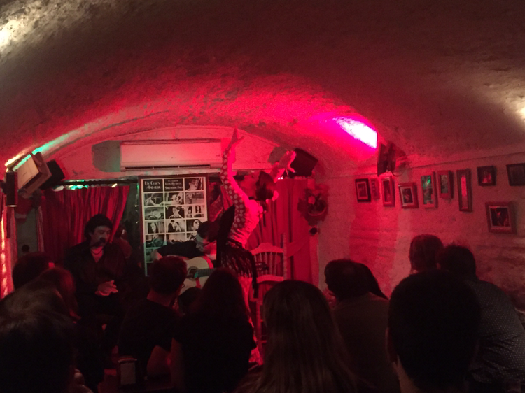 그라나다에는 동굴 안에서의 플라멩코 공연이 있다고 해서 알함브라에서 내려오는 길에 발견한 동굴 플라멩코 공연장에서 티켓을 샀다. 사실 티켓을 사려는 생각이 먼저 있었던 건 아니었는데, 내려오는 길에 어디선가 기타소리가 들려 따라 가보니 거리에서 춤을 추고 있는 플라멩코 댄서들이 있었다. 스페인의 길을 지나다니며, 몇몇 거리 공연을 봤지만 이 사람들은 지나가는 사람들의 이목을 잡고 머물게 하는 힘이 있었다. 강한 발소리와 화려한 몸짓으로 사람들의 박수를 이끌어내는 이들의 공연에, 여기서도 플라멩코를 봐야겠다는 생각 뿐이었다.