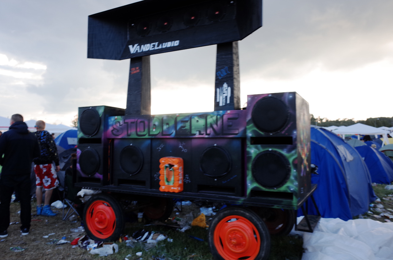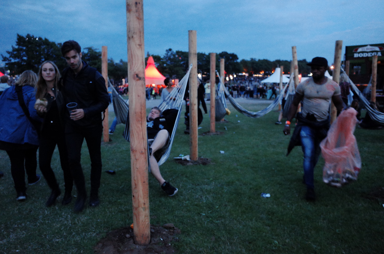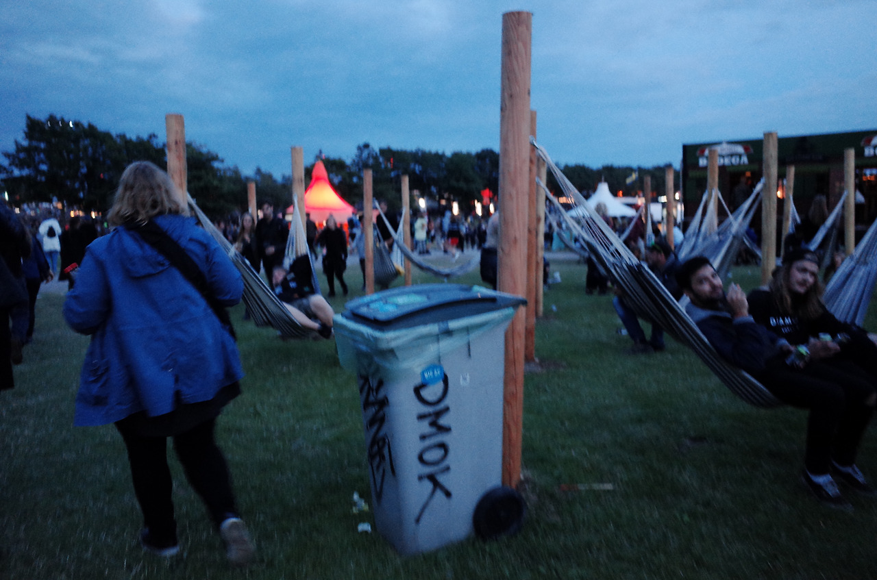 영국의 페스티벌보다는 산뜻한 잔디가 아직은 보존되어 있고 사람들이 쉴 수 있는 해먹이나 조형물, 벤치 등이 충분하게 제공되고 있는 편안한 느낌으로 첫 날의 로스킬레의 전체적인 인상은 마무리되는 듯 했다. 서브스테이지인 Arena에서 하는 Wiz Khalifa 공연이 끝난 후 돌아온 캠핑촌은, 안 그래도 어둑어둑해서 텐트 자리를 되찾으러 가기가 어려웠다. '분명 여긴데, 여긴데' 싶어 비슷한 자리를 맴돌기를 몇 여분, 원래 텐트를 친 곳에서 비스듬히 대각선 방향의 다른 텐트 뒤 쪽에 있는 내 텐트를 드디어 발견했다.