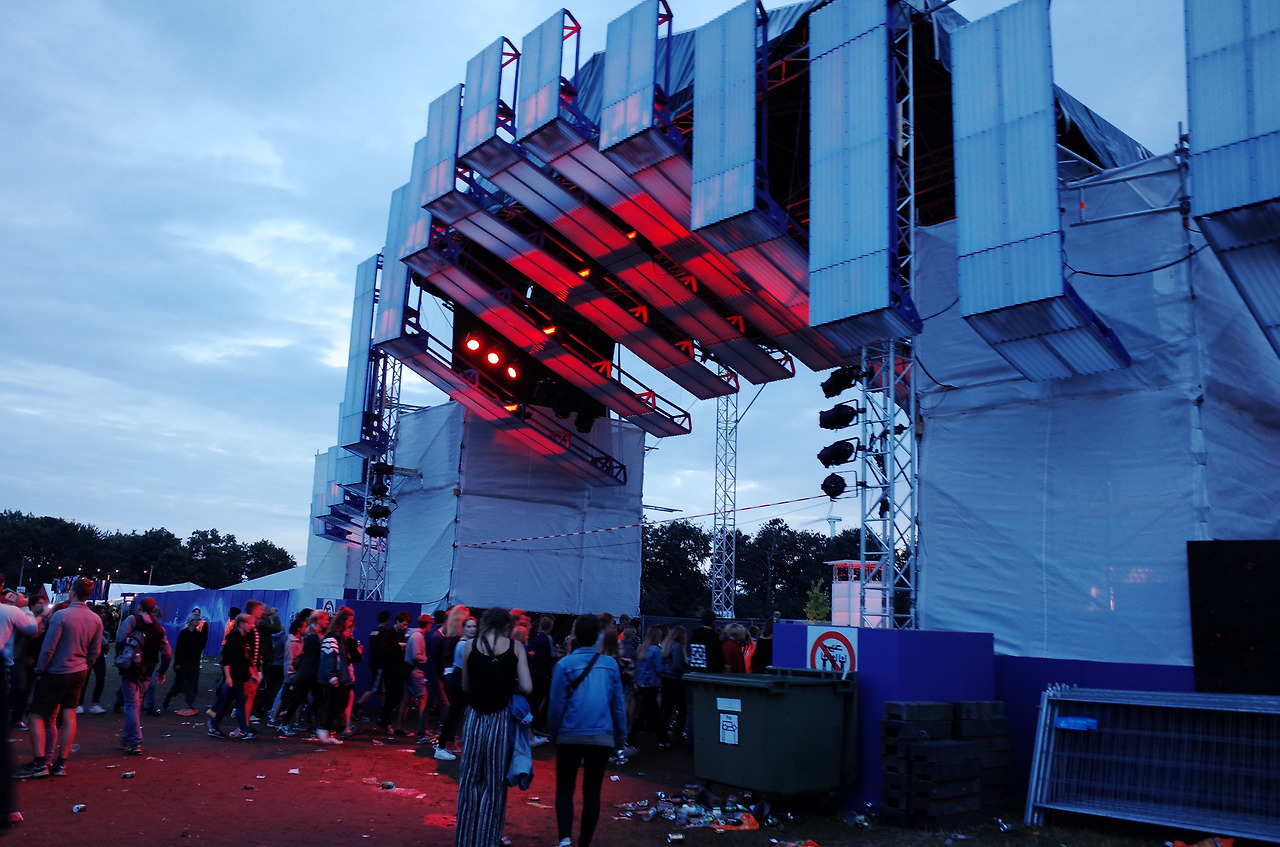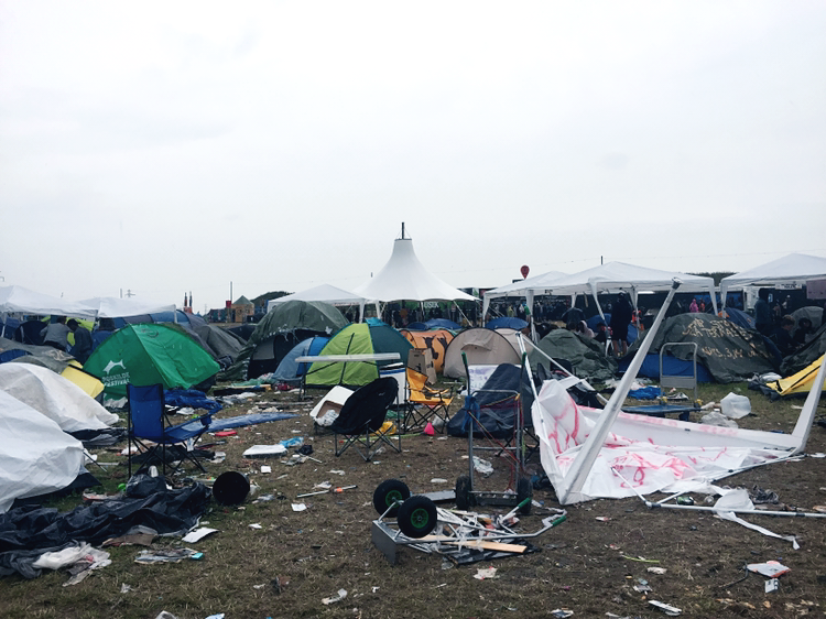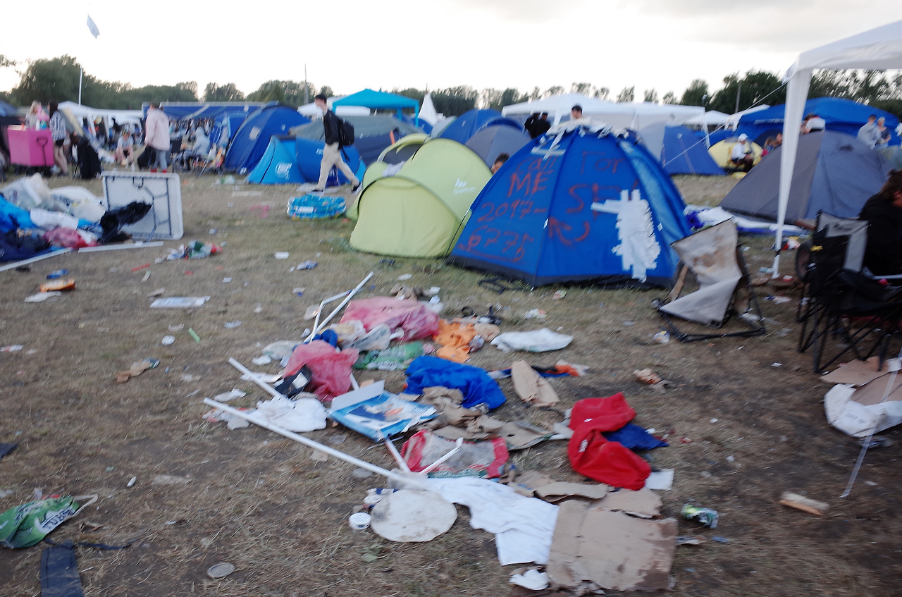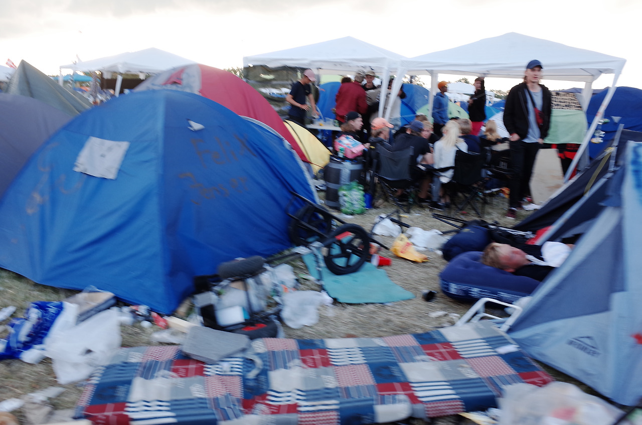 로스킬레 기차역에 내려 버스를 타고 팔찌를 받아 들어간 공연장 내부는 경악 그 자체였다. 지나가면서 쌓인 쓰레기와 벌써 망가진 것 같은 텐트와 의자들이 바닥에 나뒹굴고 있었고, 여기저기서 음악을 중구난방 다 틀고 있는데 다들 그런 것엔 아무도 신경쓰고 있지 않고 있었다. 이 분위기에 적응 못 하고 있는 사람은 그저 나 한 명 뿐인 듯 했다.