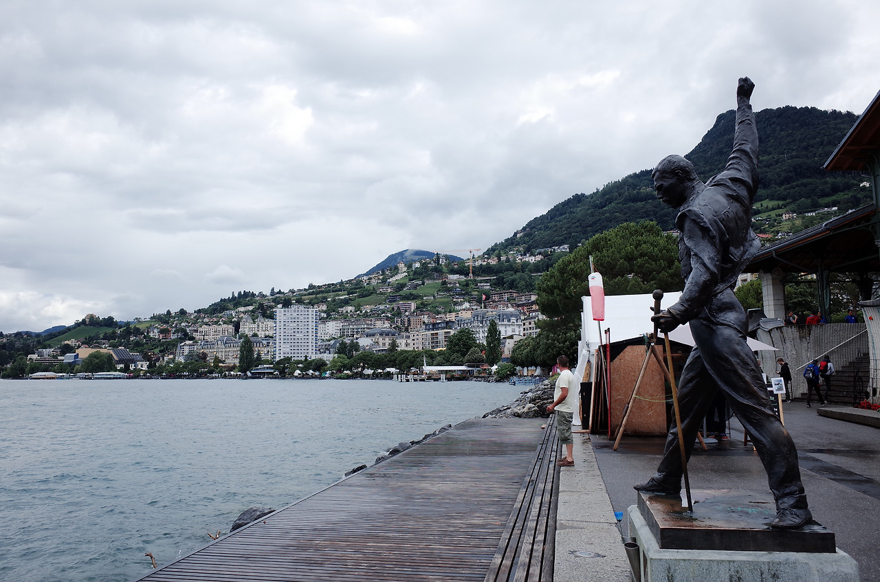 호수를 빙 둘러싼 길엔 메인 공연장인 오디토리움 스트라빈스키가 있는 큰 공연장 건물도 있었지만, 천막처럼 세워둔 간이 공연장이나 밤에 DJ가 음악을 트는 클럽같은 곳들도 중간중간에 있었다. 그 사이사이에 자리한 벤더들에서는 각국의 음식과 기념품 등을 판매했고, 공식 머천다이즈를 판매하는 부스도 야외에 별도로 있었다. 벤더들을 구경하며 쭉 호수를 따라 올라가다보니 탁 트인 레만 호수에서 도시의 전경을 한 눈에 조망할 수 있는 곳이 있었다. 그 곳에 서 있는 동상이 있었으니, 그는 바로 프레디 머큐리였다. 살아서 그리 사랑했다던 몽트뢰의 한 가운데에서 호수를 바라보며 마이크를 들고 선 그의 역동적인 동상은 잔잔한 호수와 대비를 이루고 있었지만, 이 조합이 잔잔하듯 역동적인 재즈와도 닮아있다는 느낌이 스쳤다. '마음의 평화를 느끼고 싶다면 몽트뢰로 오라'고 했던가. 죽어서도 그 곳에 세워진 그의 동상 덕에 그는 지금 평화로울까.