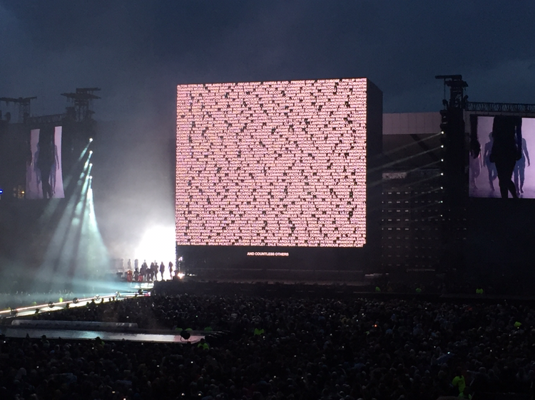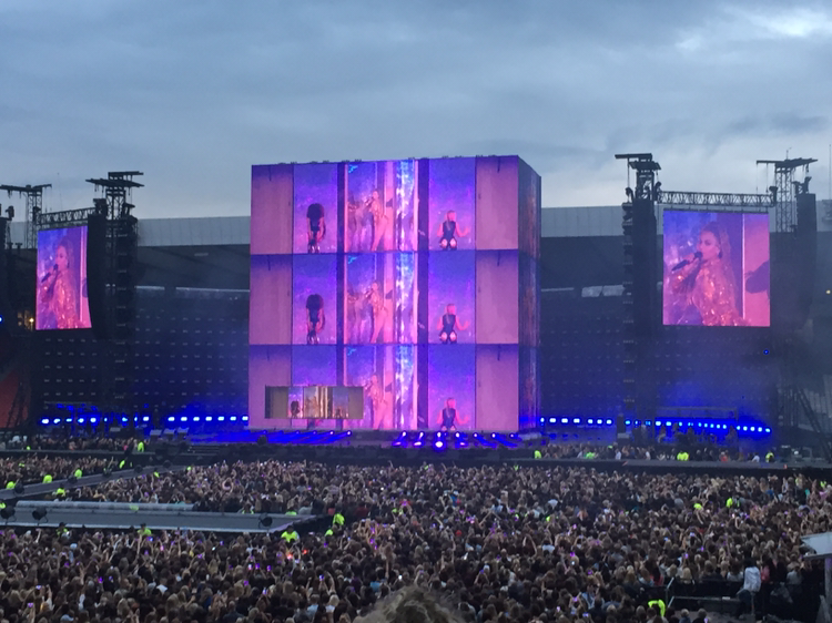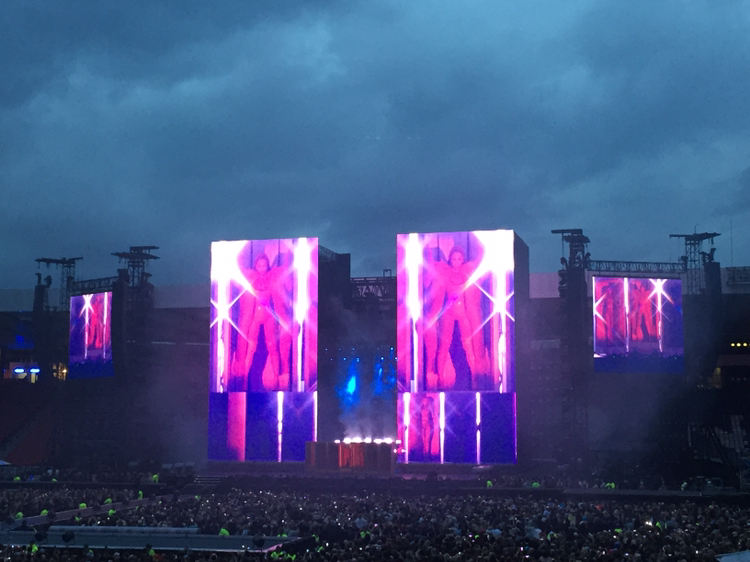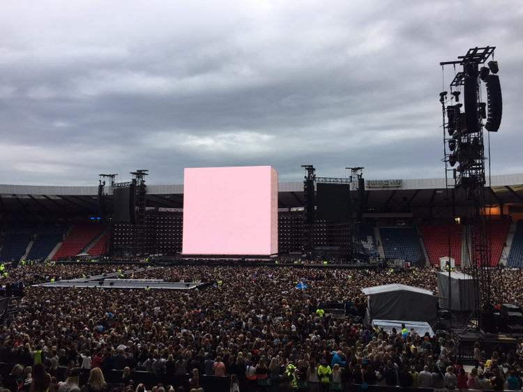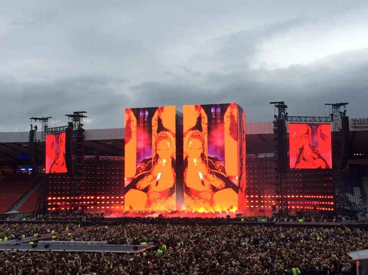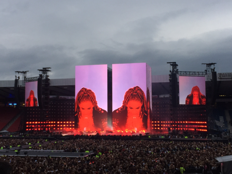 기차에서 이미 공연장에 가기 전부터 벌써 만취한 언니의 'Love on Top' 선창에 맞추어 기차 칸에 있던 사람들이 떼창을 하며 도착한 Hampden Park National Stadium에는 많은 사람들로 북적거렸다. 넓은 공연장에서 내 자리를 찾아 가기까지는 꽤나 시간이 많이 소요되었다. 시큐리티를 통과해 들어간 공연장의 관중석은 빼곡히 차있었다.
