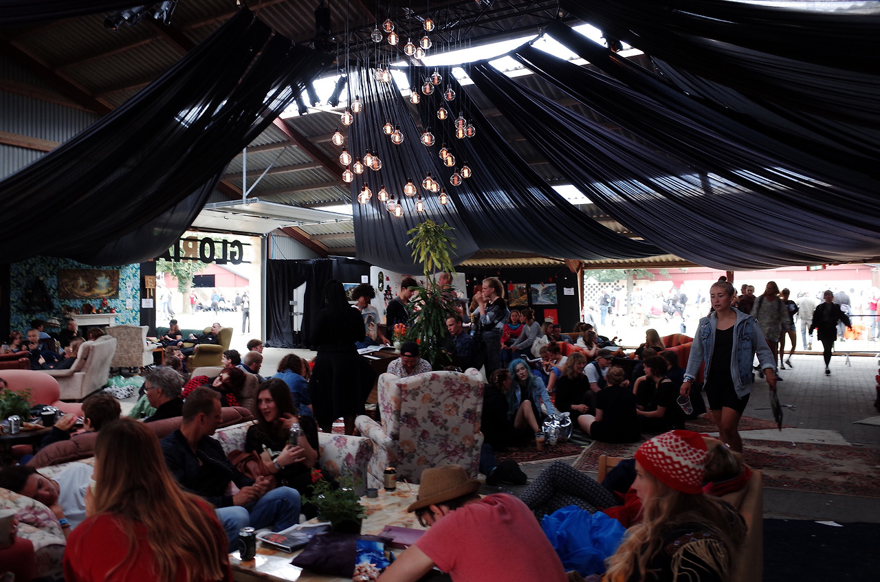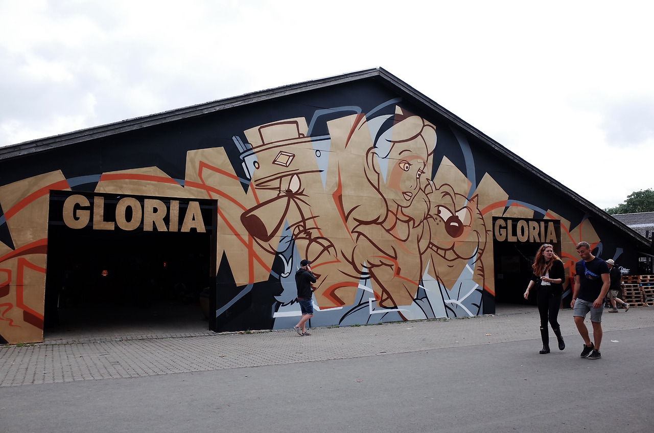 늘어선 스테이지들의 중간에 자리한 Gloria는 컨테이너처럼 생겼는데 안에 들어가면 여기저기서 가져다둔 듯 한 빈티지한 가구들이 놓여져 있고, 가드들이 지키고 있는 안 쪽으로 들어가면 공연장이 있는 구조였다. 붉은 조명으로 장식된 내부에는 밴드들이 공연을 하고 있었다. 스테이지 쪽으로 접근할 때마다 팔찌를 당겨서 확인하기 때문에 꼼수를 부려 들어가기는 어려워보였다.