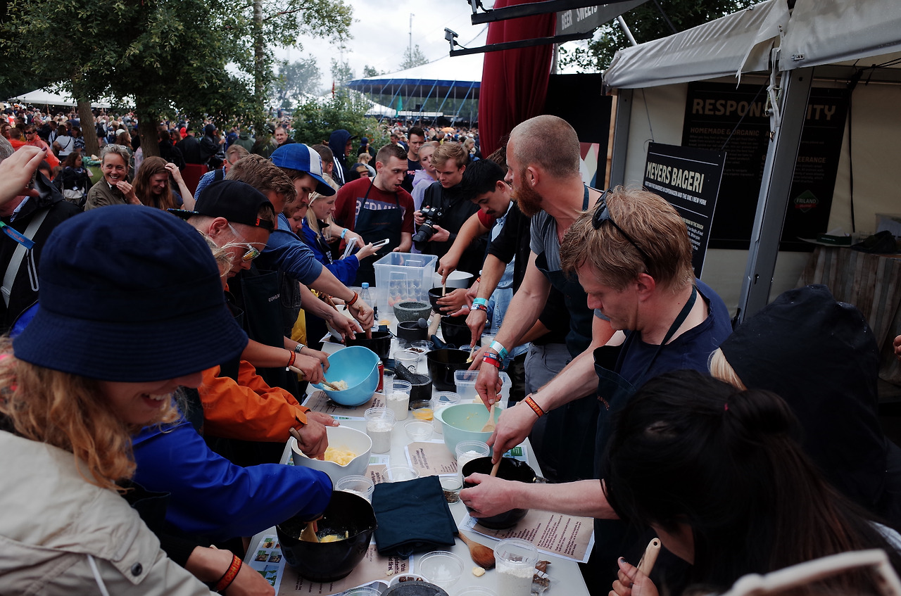 무대 사이에 중간중간 설치되어 있는 큰 F&B 벤더들과 넓게 위치한 식탁과 의자 등은 누구나 사용하기 편리하게 되어 있었다. 버거부터 베트남쌀국수까지의 다양한 선택지를 갖고 있는 푸드벤더는 전체적으로 가지 수가 많다기보다는 큰 규모로 이루어진 몇몇 개의 숍이 늘어서 있는 느낌이었다. 페스티벌 기간 중에는 베이커리류를 취급하는 벤더 앞에서 베이킹워크숍과 같은 참여 프로그램도 진행되었고, 쿠키를 구워 나누어 먹기도 했다. 베이킹 프로그램은 덴마크어로 진행되었기 때문에 나는 옆에서 참여하는 사람들을 줄곧 구경했는데, 반죽을 섞는 사람들이 하나같이 신이 나 있다. 방관자로서의 나는 그 신난 사람들의 '동심으로의 귀환'을 보는 게 좀 더 재미있다.
