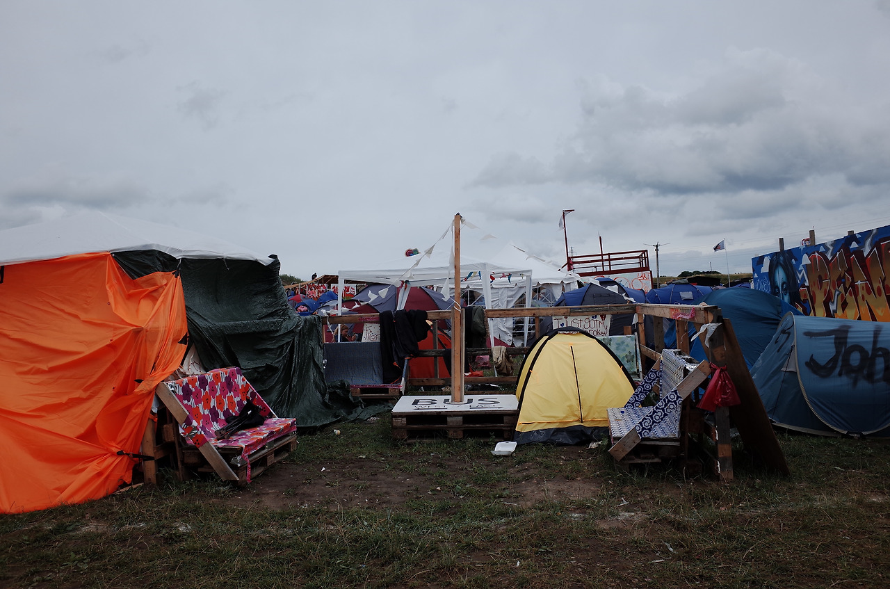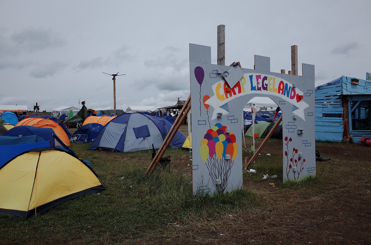 마지막 날에는 그동안 머물렀던 동쪽 캠핑존과 스테이지를 지나 서쪽 캠핑존 및 Rising Sun 스테이지가 있는 쪽으로 가보기로 했다. 며칠을 이어 내리던 비 때문에 철길 건너 편 캠핑존이 더 진흙이 된 정도가 심했다. 라이징선에서 진행되는 공연과 프로그램들은 초반에 지나가고 마지막 날쯤엔 거의 비어있었다. 사람들은 스테이지 주변에 삼삼오오 모여앉아 쉬고 있었다.