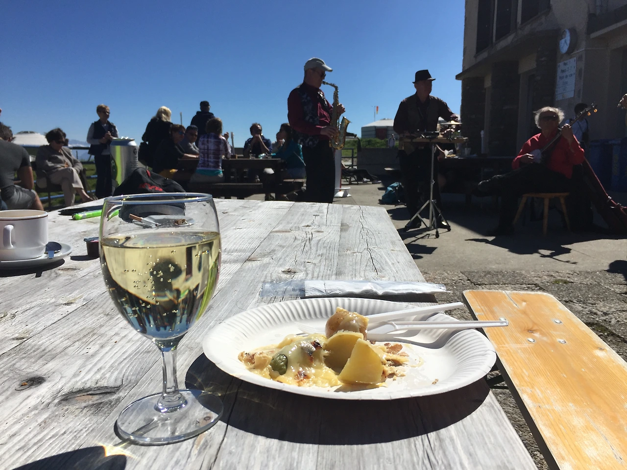 알싸한 찬바람과 뜨거운 햇살을 받으며, 조그만 나무판자로 되어 있는 상점에서 라끌렛과 화이트와인을 샀다. 라끌렛이 뭔지도 모르고 주문을 했는데 지글지글 큰 치즈덩어리를 데워 녹이더니 감자와 햄들 위로 삭 덮어주는 게 아닌가. 요망한 음식이었다. 당연히 맛있을 수밖에. 기차에서 음악을 연주하던 연주자들이 악기를 가지고 내려 야외에서 다시 연주를 하기 시작한다. 라끌렛과 살짝 노란 빛을 띈 화이트 와인의 조화, 그리고 풍경에, 재즈 연주까지 모든 것이 완벽했다. 정말 이보다 좋은 곳이 또 있을까. 내가 지금 이 곳에 있는 게 너무나 자랑스러워질 지경이었다.