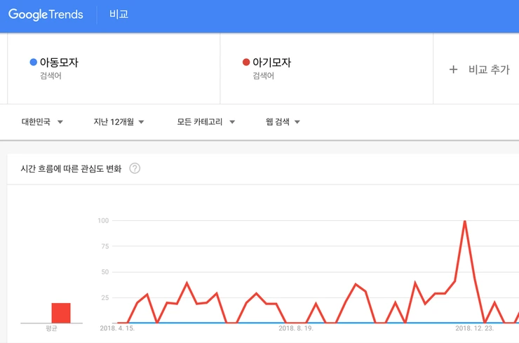 쇼핑몰 상품을 보다가 아동모자라는 상품설명이 눈에 띄어서 또 구글트렌드로 비교검색을 해봤는데요.