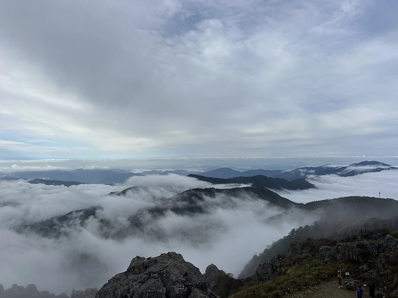 운무 속 천왕봉이 떠오르고,