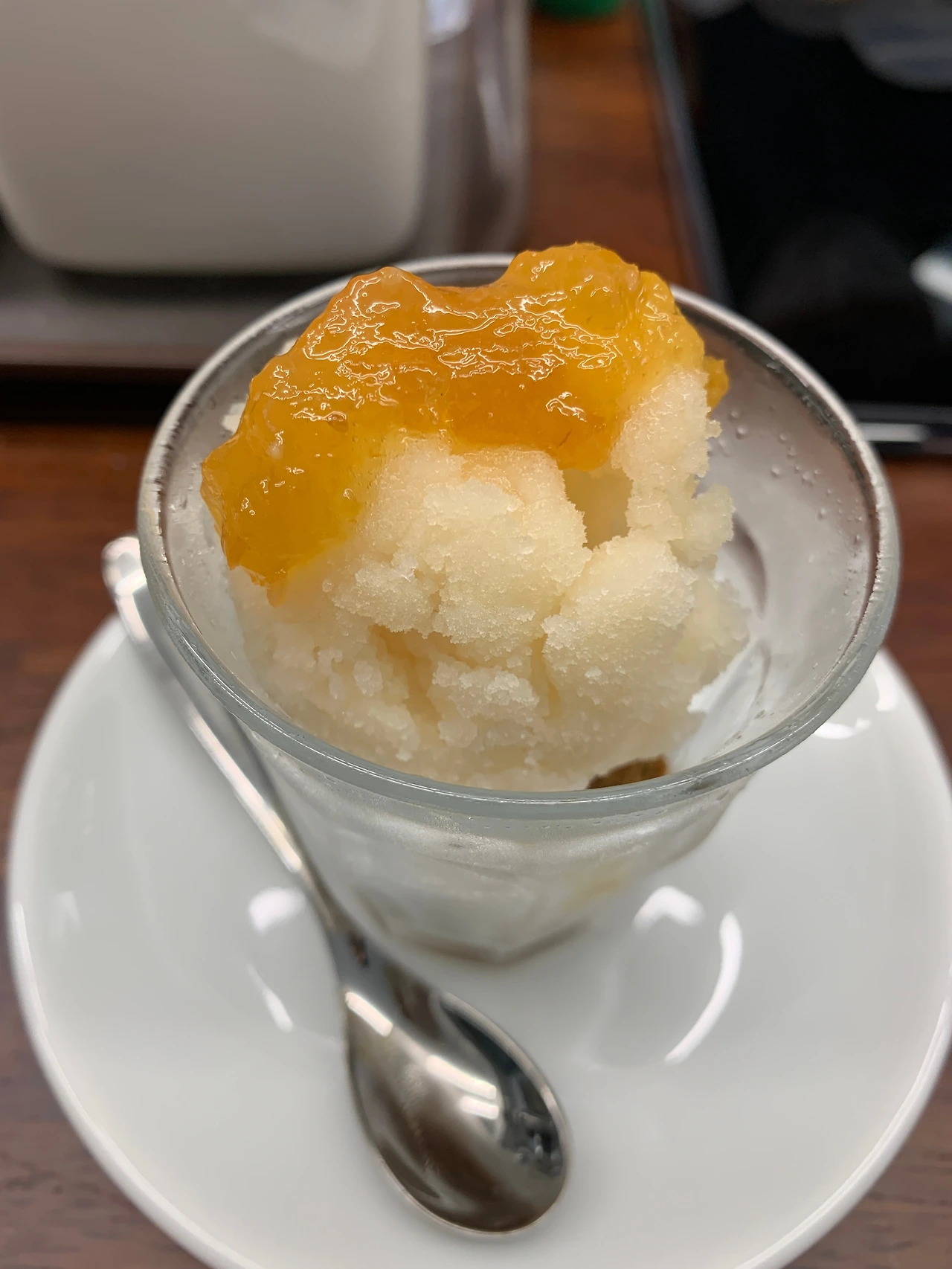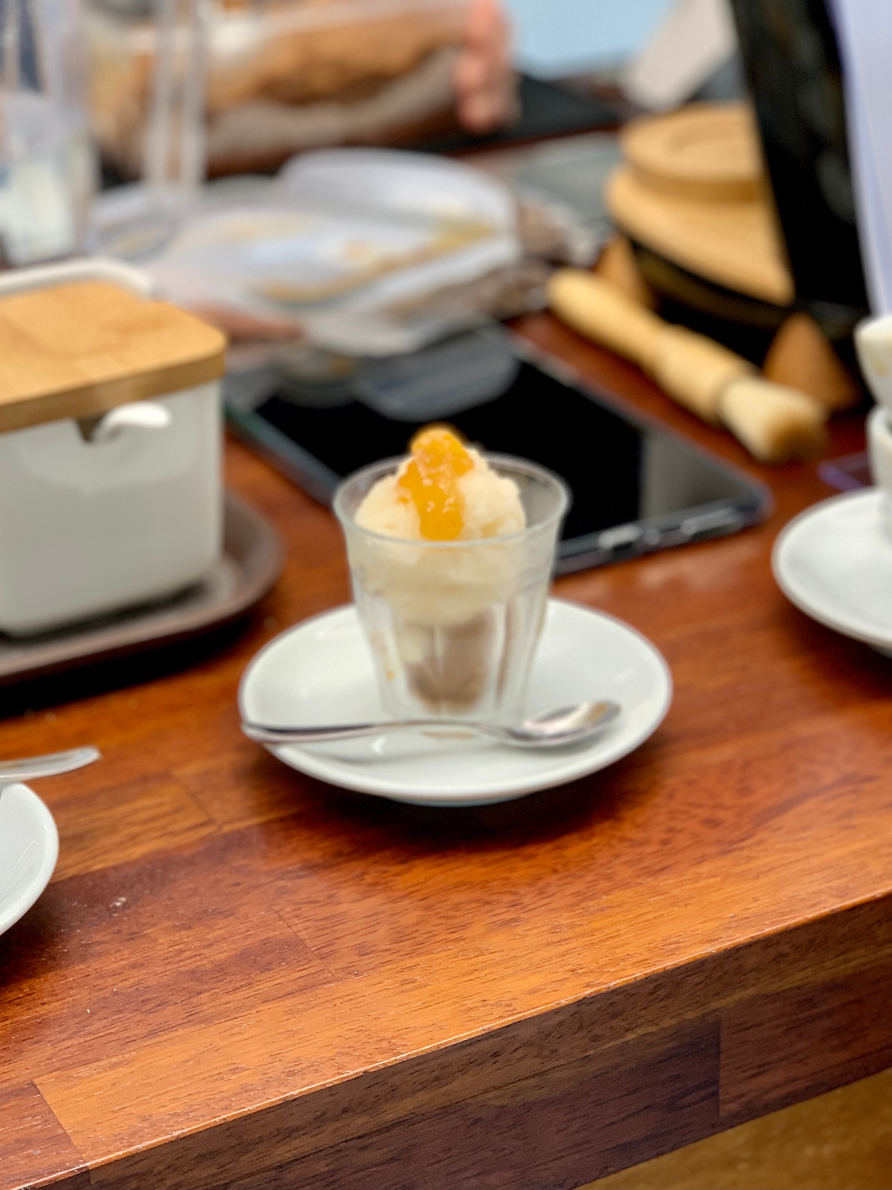 재미있는 메뉴가 하나 생겼더라구요. 바로 소르베토 알라 멜라입니다. 커피 소르베토 위에 사과 셔벗을 올리고 비터오렌지 마말레이드로 마무리했습니다. 신기하긴 한데 사과랑 오렌지가 커피랑 어울릴까 걱정했는데요, 기우였습니다. 세 가지 재료를 한 스푼에 떠서 먹어봅니다. 달달한 소르베토와 사과 셔벗의 산미를 오렌지 제스트가 섞인 마멀레이드의 쌉쌀한 맛이 깔끔하게 잡아줍니다. 원래는 사과 주스에 섞어먹었던 메뉴였다는데요, 이렇게 얼려서 물성을 바꿔 풀어낸 점이 놀랍습니다. 추천합니다.