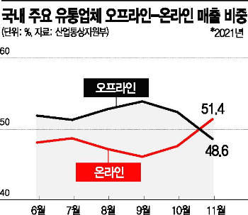 산업부가 2016년 온라인 유통업체를 조사에 포함시킨 이후 온라인 매출이 오프라인을 앞선 것은 이번이 처음. 온라인 유통업체 매출 비중은 코로나19 사태를 거치며 급증. 22년 유통家 '물류·배송 전쟁' 격화.