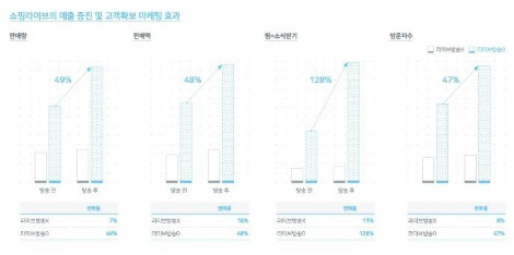 쇼핑라이브를 진행한 스마트스토어들의 매출은 쇼핑라이브를 진행하지 않은 스토어와 비교해 판매량은 평균 49%, 매출은 48% 늘었다. 쇼핑라이브를 진행하는 스토어들은 쇼핑라이브 전후로 스토어찜과 소식받기 지표(128%), 방문자수(47%) 지표도 모두 급증한 것으로 나타났다.
