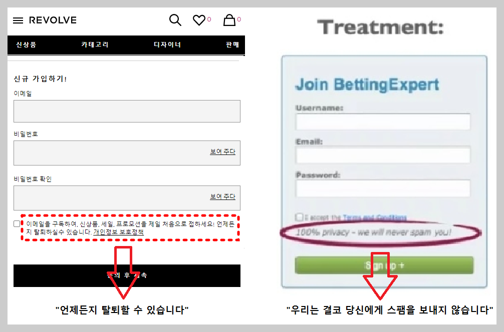 그림에서처럼 "우리는 결코 스팸메일을 보내지 않습니다"라는 멘트는 회원으로 가입하려는 고객들에게 부정적인 이미지를 불러일으킨다. 또한 당신이 '아이 돌보미'를 구하려는 데, 인력업체가 소개하기를 '이 돌보미는 절대 아기를 학대하지 않습니다"라고 한다면 당신의 마음은 어떻겠는가? 두려움을 일으키는 이와 같은 말은 '사족(蛇足)'일뿐 아니라 절대 사용하지 말자.