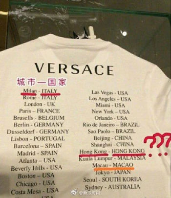 8월에는 이탈리아 명품 브랜드 '베르사체 Versace'가 중국을 다시 한번 도발한다. '베르사체'가 디자인한 티셔츠에 홍콩과 마카오를 독립된 국가로 잘못 표기한 것이다. 이는 중국이 매우 민감하게 생각하는 ‘일국양제(一國兩制)’ 원칙에 반대하는 듯한 인상을 주게 된다. 논란이 일파만파 커지자 '베르사체'는 이에 대한 사과와 함께 문제의 티셔츠를 전량 파기하기에 이른다.