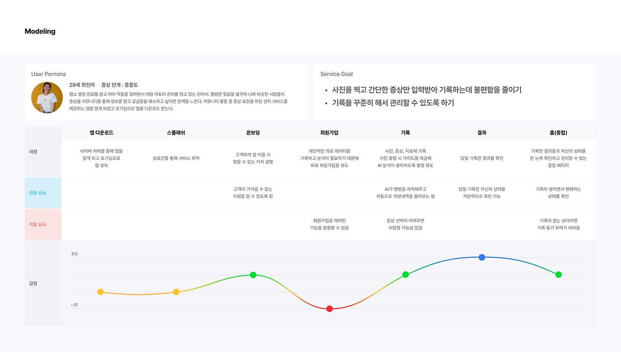 나는 아토피 환자들을 위한 앱 ‘아토닥’을 만들면서 서비스 소개 단계에서의 저니맵을 작성해 봤다. 앞서 유저 리서치를 통해 잠재 고객들의 예상 행동이나 감정 등을 유추하면서 페르소나에 따른 유저 시나리오를 간략하게 작성했고 그에 따라 주요 페이지 내에서 어떤 행동을 할지를 적었다. 이 때는 사실 '이 저니맵은 서비스 소개 단계이니 이런 항목으로 작성해지'라는 생각보다는 여러 저니맵들을 보고 참고해서 공통적인 항목을 뽑아 작성했기 때문에 서비스 소개 단계의 저니맵이라고 하기에는 서비스를 알게 된 경로라던가, 터치 포인트가 부족하다.