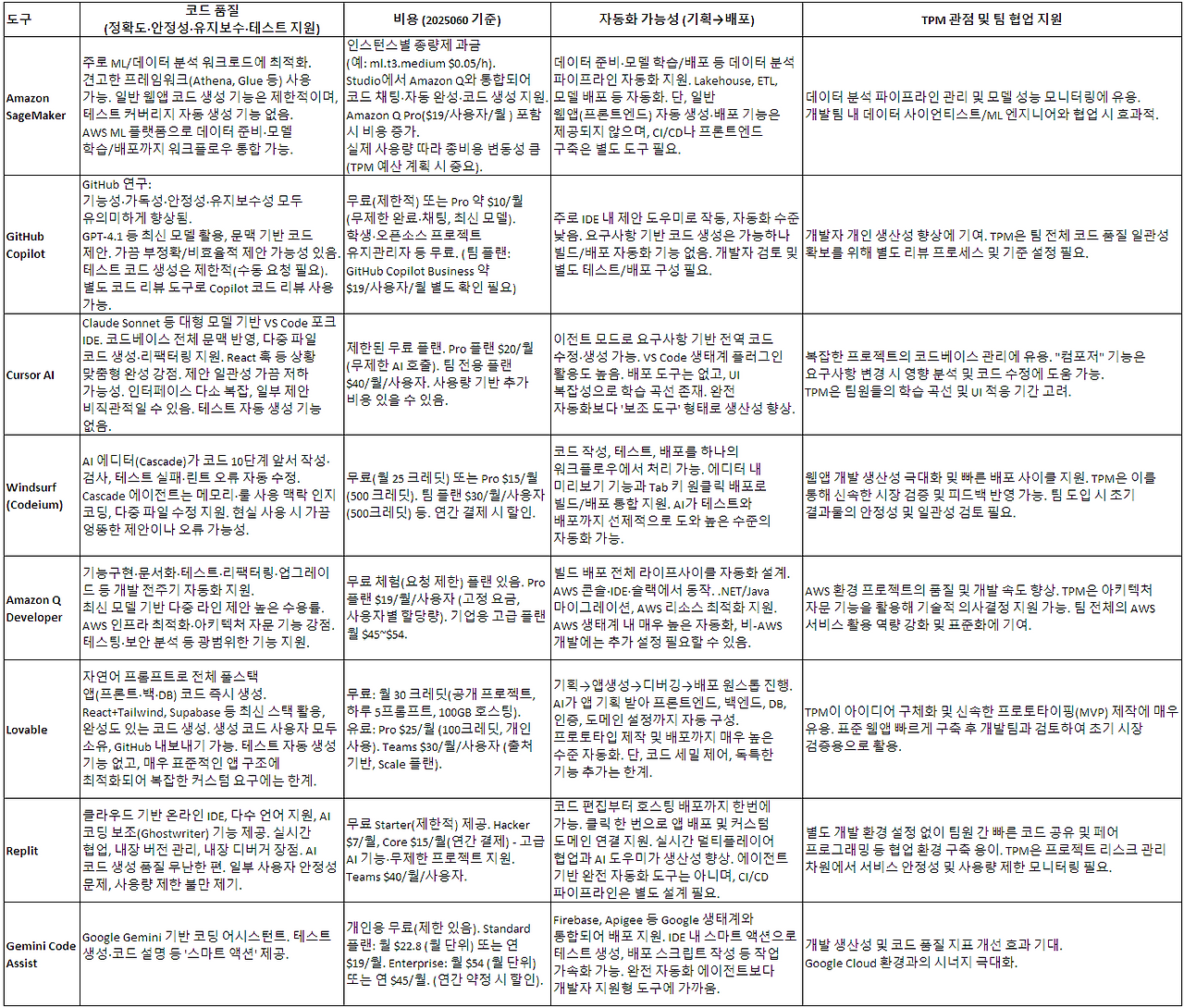 아래 표는 주요 AI 코딩 도구들을 TPM 관점에서 정리한 것이다.