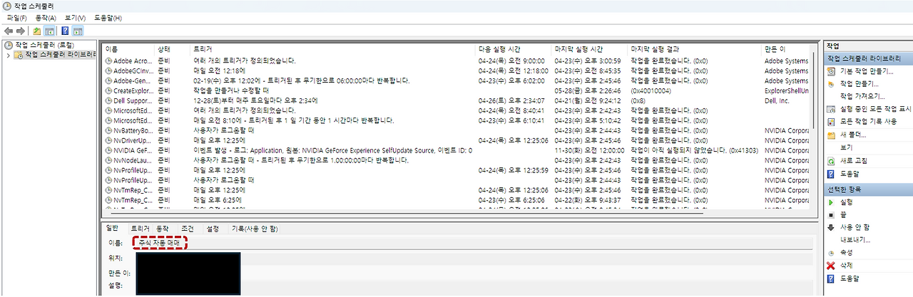 주식 시장 종료 후, 프로그램1(종목 선정)을 실행하고, 주식 시장 중에는 프로그램2(종목 매매)의 실행은 Windows OS가 기본 제공하는 '작업 스케쥴러'를 활용하였다.