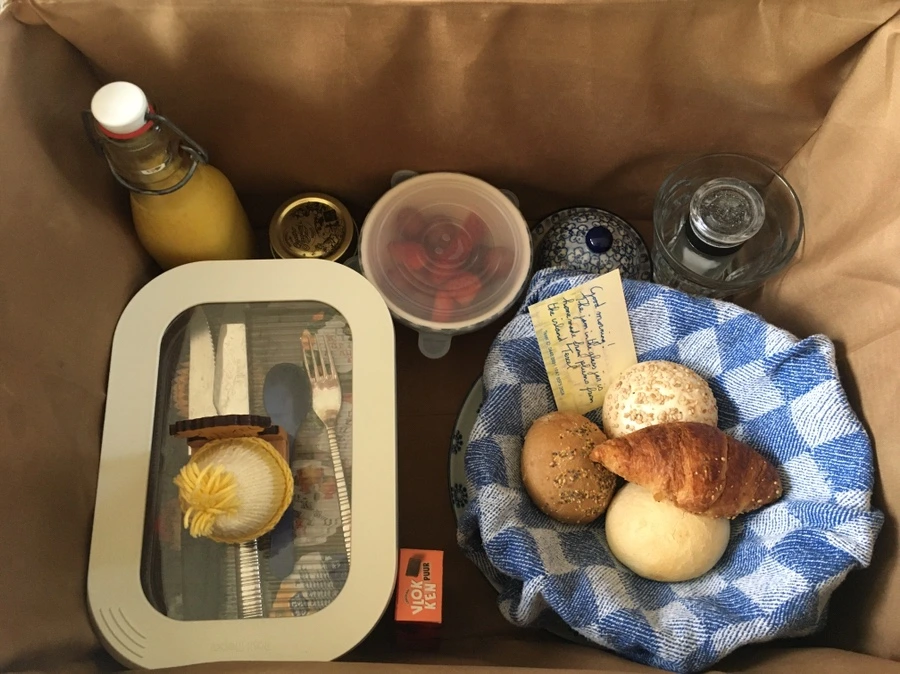오전 8시 27분, 문 밖에서 아침이 준비되었다는 말이 들려서 나갔더니 귀여운 바스켓이 놓여있다. 열어보니 빵과 음료, 각종 잼과 치즈들이 보기 좋게 들어 있어 하루를 기분 좋게 시작할 수 있을 것 같았다. 여러 가지 잼 중에서도 유리잔에 담긴 것은 텍셀에서 자란 열매로 직접 만들었다는 메시지가 필기체로 깨알같이 적혀있었다. 살짝 신맛이 났지만 시나몬 향도 나는 것이 지금까지 못 먹어봤던 신기한 맛이라 그것 위주로 먹었다.