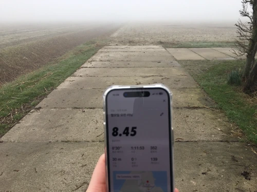 오전 9시 37분, 잠깐 온라인 자막 처리를 해달라는 실장님의 요청에 예상 시간보다 늦게 숙소에서 나왔는데 날씨가 심상치 않다. 안개가 껴서 근방 20m 정도 뒤로는 아무것도 보이지 않았다. 이 길 속에서 8km를 뛰어야 한다니. 아 그리고 지금부터는 생각이 날 때마다 메모하러 멈춰설 수 없으니, 대여점에 도착할 때까지는 녹음기를 켜서 여행기를 진행하려고 한다.