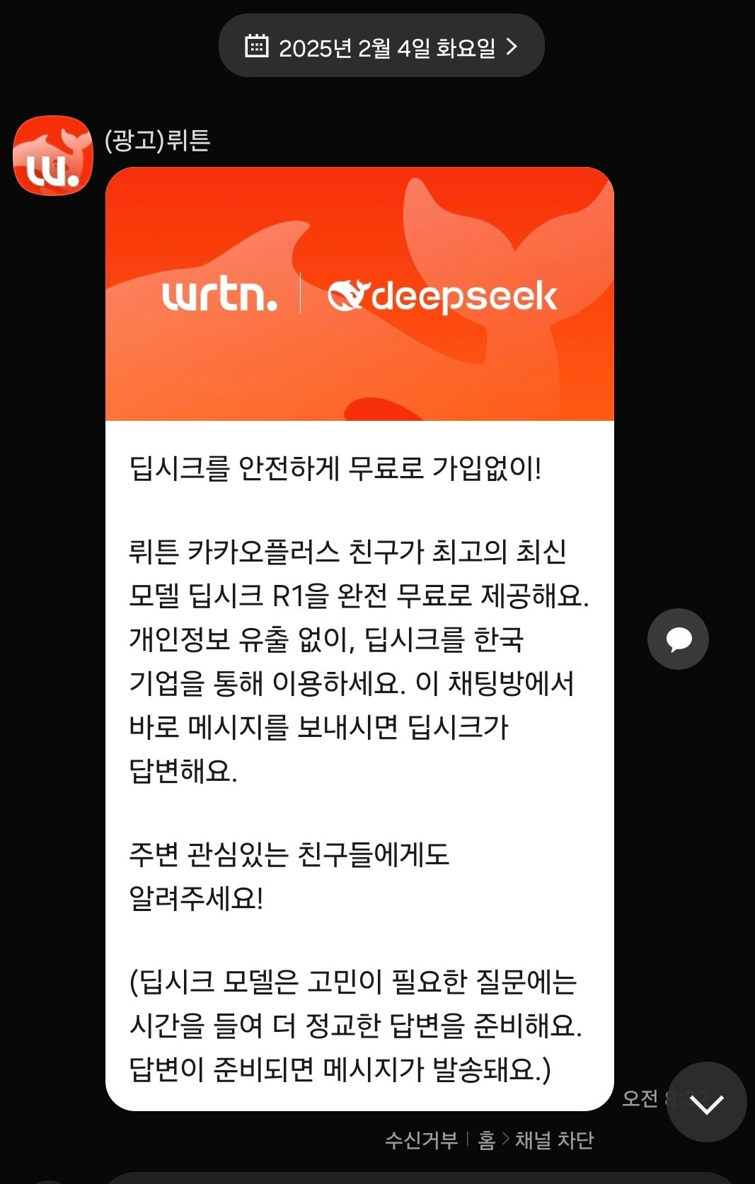 3. 무료 및 무제한 제공: 카카오톡 뤼튼 채널에서 딥시크 '안전 서비스'를 무료로 무제한 제공하여 사용자가 쉽게 접근할 수 있게 했습니다