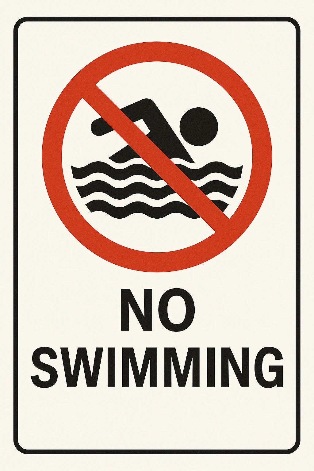 호수 앞에 세워둘 수영금지라는 팻말을 하나 만들려고 하는데 누구나 내용을 잘 이해할 수 있도록 픽토그램과 영어안내문 들어간 디자인 부탁해.