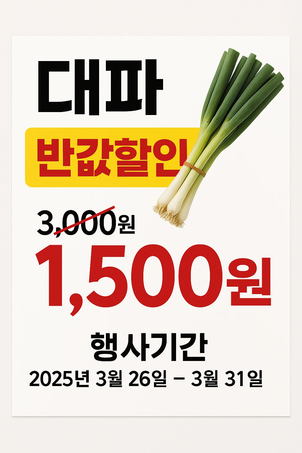 마트에서 신선식품 담당자인데 대파 가격을 3000원에서 1500원으로 할인해서 판매한다는 POP디자인을 하나 하고 싶어. 맨 아래쪽에는 행사기간을 2025년 3월 26일~3월 31일까지라고 표기해줘. POP사이즈는 A4크기로 만들어주고 대파이미지도 넣고 가격은 눈에 잘 띄게 디자인해줘.