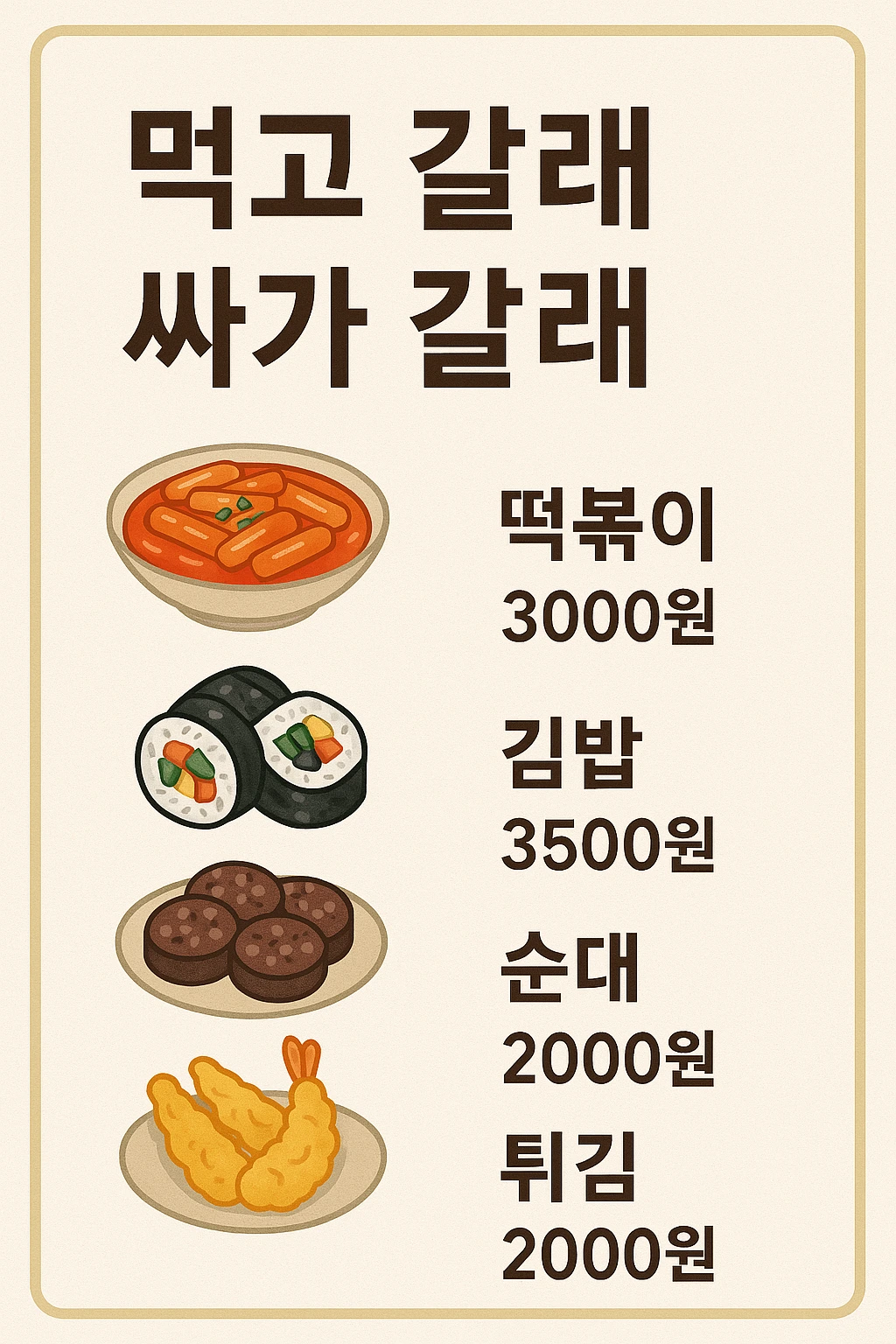 분식집 창업을 준비 중인데 메뉴판 포스터 이미지 초안이 필요해. 식당명, 메뉴와 가격은 아래와 같아. 한글로 부탁해.