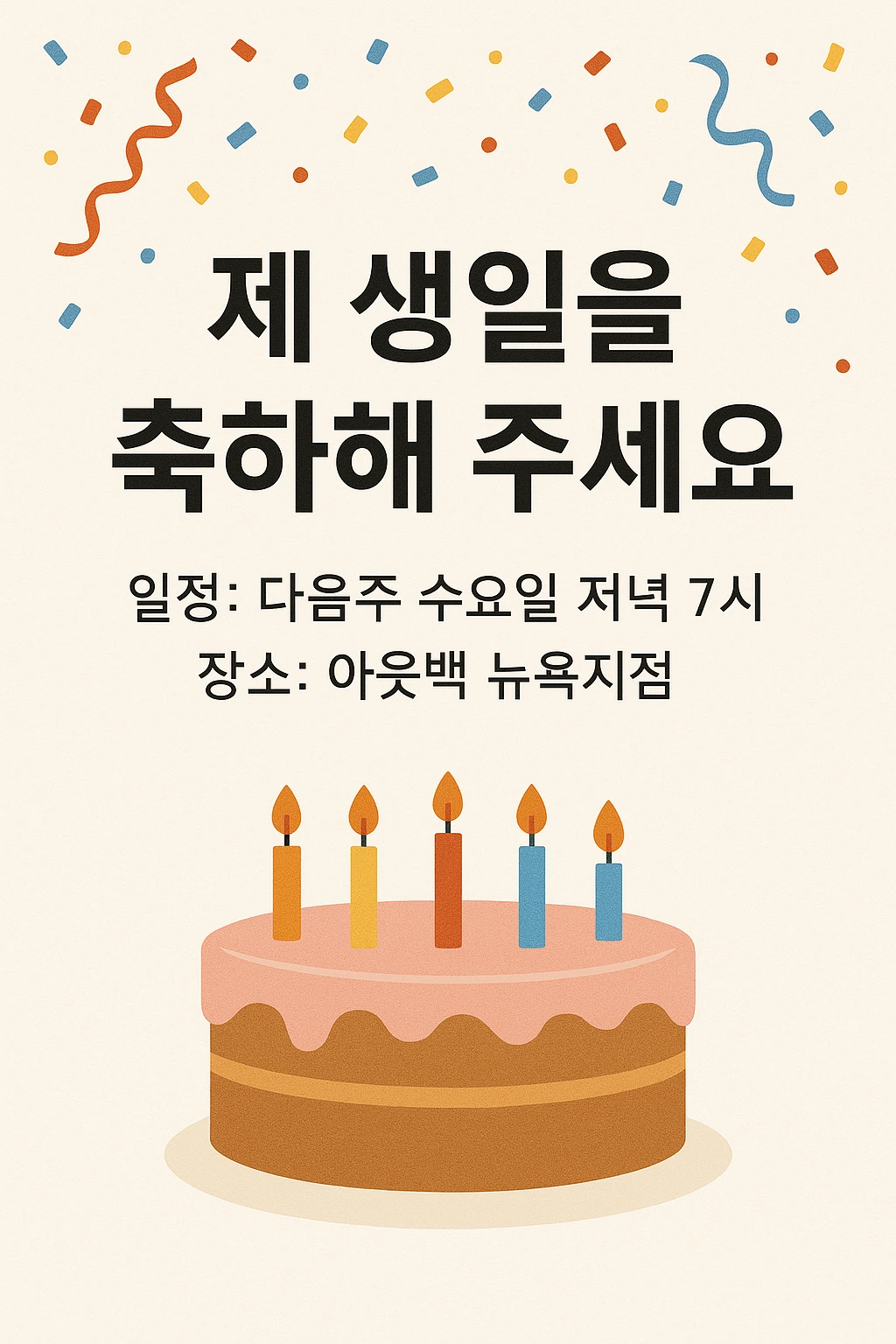 생일초대카드를 만들고 싶은데 문구는 '제 생일을 축하해 주세요. 일정 : 다음주 수요일 저녁7시, 장소 : 아웃백 뉴욕지점' 이렇게 한글로 입력해줘.