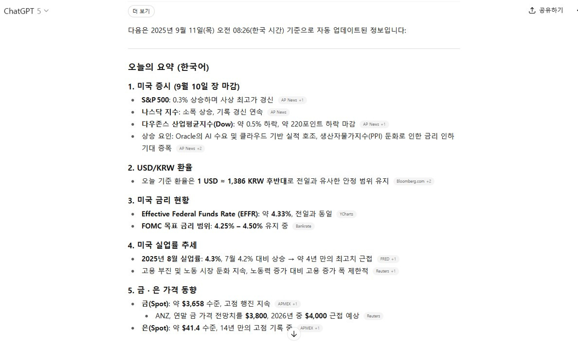 그리고 챗GPT의 일정등록 기능을 이용하면 원하는 정보나 알림을 원하는 시간에 받아 볼 수도 있습니다. 그전에는 매일 아침 직접 확인해야 했던 날씨, 미국증시, 금리, 환율, 금은시세 등과 같은 정보를 검색 요약해서 알림을 달라고 설정했더니 정해준 목표와 시간에 맞게 내용을 정리해서 PC와 모바일앱에서 알림을 주니 편리합니다. 뿐만 아니라 매일 밤에 복용해야 하는 약도 잊을 때가 많은데 알림 등록을 했더니 놓치는 일이 없습니다.