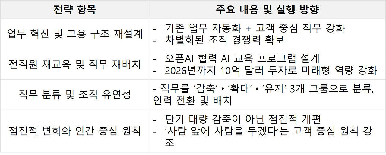 이는 매출이 증가해도 직원 수는 유지하되, 직무 구성 자체는 크게 변할 것임을 의미합니다. 일부 직무는 감축하고, 또 다른 직무는 신설하는 구조적 변화가 실질적으로 일어나기 시작했습니다. 현장에서는 창고 자동화 확대, 백룸 업무 자동화 등 AI 활용이 증가하면서 반복적·비접점 업무는 점진적으로 줄어드는 반면, 새로운 AI 관련 직무(예: 에이전트 빌더)가 생기고 있습니다.