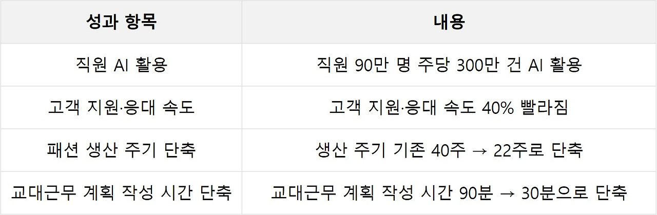 이 전략은 단순히 자동화로 인한 비용 절감이 아니라, AI 역량 내재화와 인간 자원의 가치를 동시에 높이는 균형적 모델입니다. 월마트는 소매업계의 ‘선택과 집중’을 AI 기술로 실행하며, AX시대의 표준을 선도하는 시험대 역할을 하고 있습니다. 2025년 현재까지 월마트의 주요 AI성과는 아래와 같습니다.