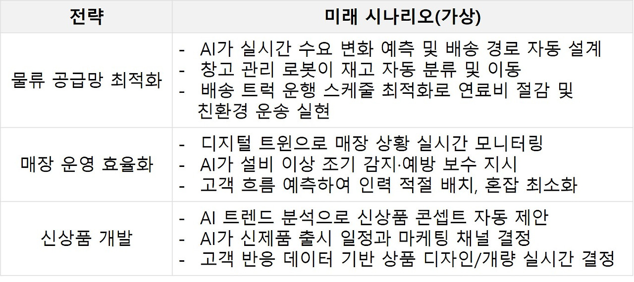 그리고 구체적인 월마트의 AI활용전략은 크게 3가지로 물류 공급망 최적화, 매장운영 효율화, 신상품 개발로 미래 시나리오를 그려보면 아래와 같습니다.