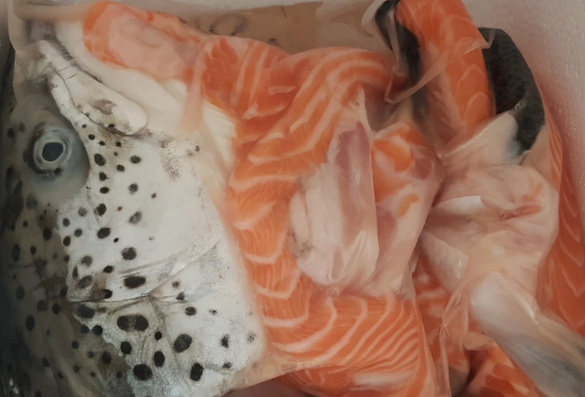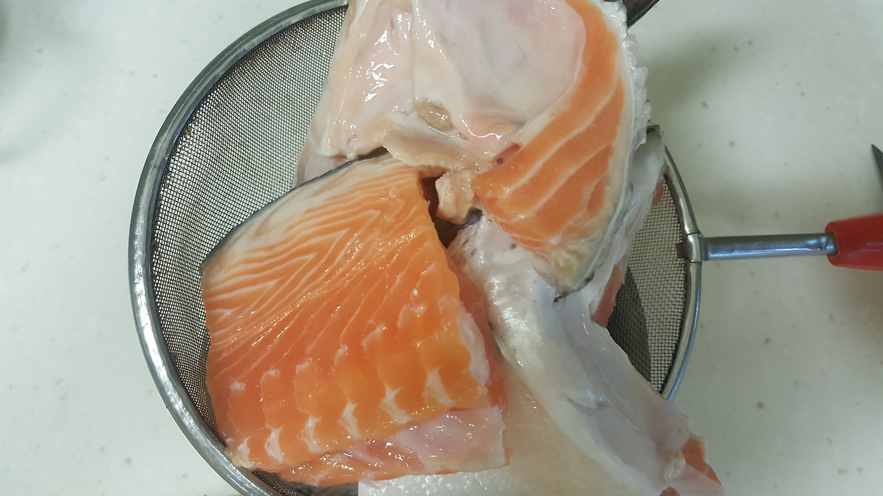 유물 발굴하듯 연어머리 발라 버려~~ | 매거진 지난 콘텐츠에서 연어머리, 연어갈비 등 구입했던 것 중 이제 남은 건 연어머리인데 드디어 작업 들어갑니다. 눈을 보고 있자니 조금 미안하지만...