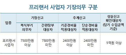 아래 표로 따지자면 나의 경우는 기장신고의무에 간편장부대상자다. 어떻게 보면 프리랜서인 1인지식기업가들의 등급이라고 봐도 될 것 같다. 최고 등급은 성실신고 확인대상자일 거고 다음 등급이 복식부기 의무자인데 나는 세번째 등급에 속해 있는 것이다.